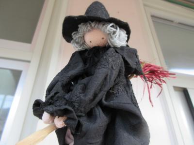 朝早く、地域の方がこの時期にぴったりの飾り物を届けてくださいました。校長室前の「校長先生のおすすめの本コーナー」に絵本と一緒にディスプレイできるように魔女の人形を持って来てくださいました。手作りで、とてもかわいらしい魔女です。天井から吊るしました。空を飛んでいるようです。